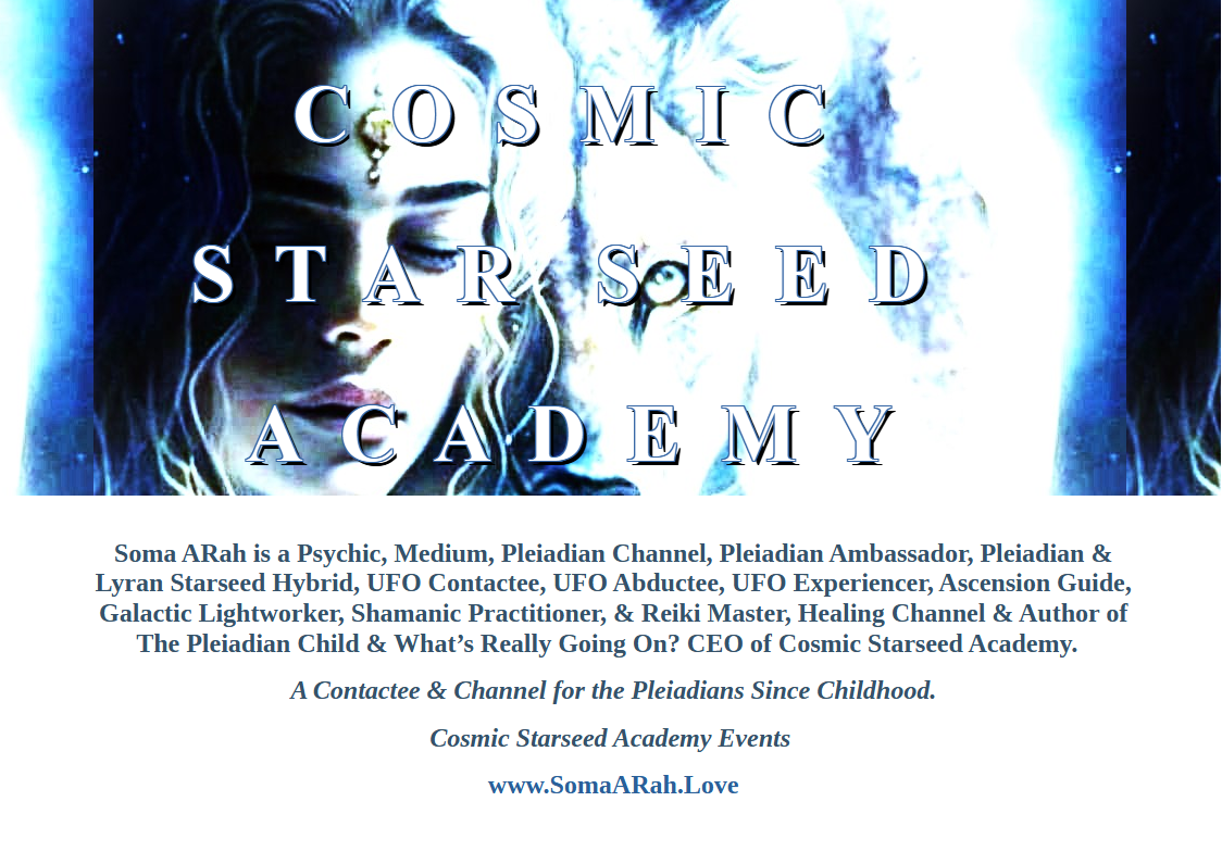Soma ARah is a Psychic, Medium, Pleiadian Channel, Pleiadian Ambassador, Pleiadian & Lyran Starseed Hybrid, UFO Contactee, UFO Abductee, UFO Experiencer, Ascension Guide, Galactic Lightworker, Shamanic Practitioner, & Reiki Master, Healing Channel & Author of The Pleiadian Child & What’s Really Going On? CEO of Cosmic Starseed Academy.